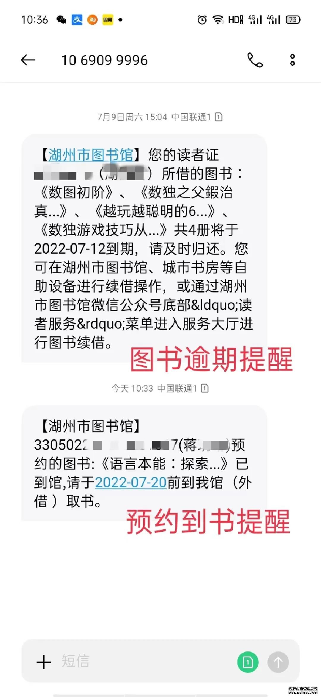 炎炎夏日,烈日當(dāng)頭,但湖州圖書(shū)館工作人員和讀者們近來(lái)心情很是美好!因?yàn)榻诤輬D書(shū)館借助短信群發(fā)平臺(tái)推出的暖心短信通知提醒服務(wù),圖書(shū)歸還、預(yù)約取書(shū)都能及時(shí)同步,受到了好多讀者朋友們的來(lái)電表?yè)P(yáng)。