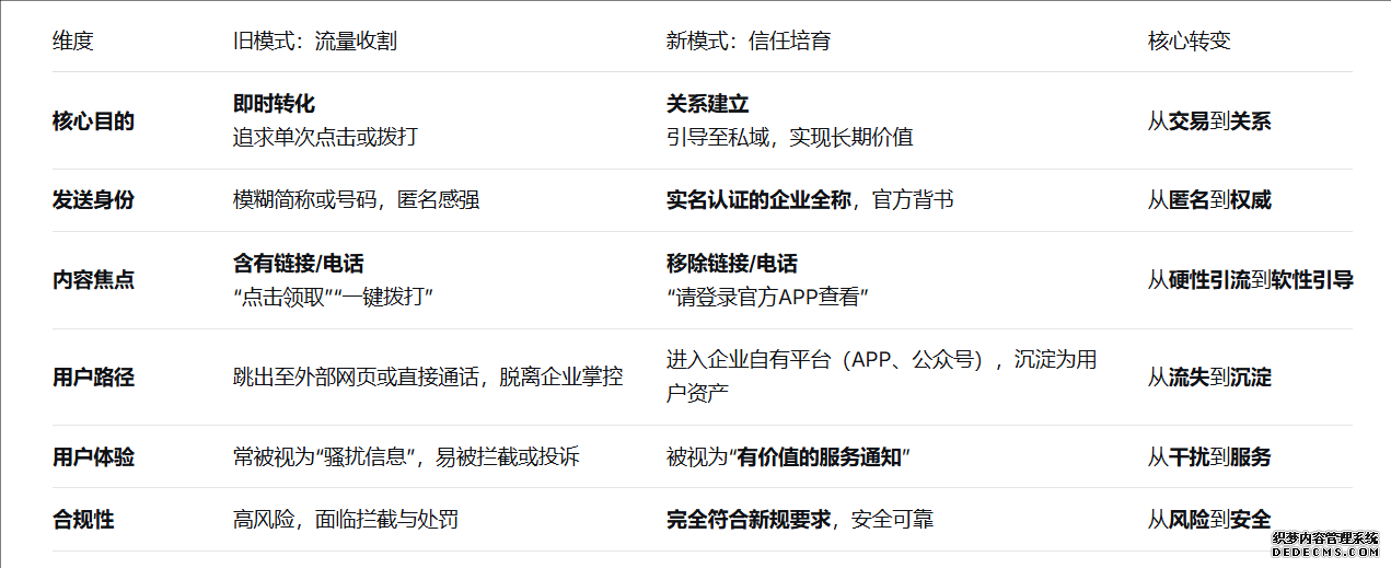 在通信監(jiān)管日趨嚴(yán)格、用戶隱私意識(shí)覺醒的當(dāng)下,那條曾被視為“直接觸達(dá)通道”的企業(yè)營銷短信,正站在變革的十字路口。2025年一系列新規(guī)的實(shí)施,并非簡單意義上的“限制”,而是一次深刻的行業(yè)價(jià)值重構(gòu)。它促使企業(yè)必須告別過去廣撒網(wǎng)、強(qiáng)干擾的粗放模式,轉(zhuǎn)而將短信營銷升維為一個(gè)基于合規(guī)前提、信任基石與價(jià)值交互的精準(zhǔn)溝通體系。企業(yè)若想在其中贏得先機(jī),關(guān)鍵在于實(shí)現(xiàn)三大核心轉(zhuǎn)變。